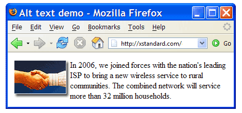 Though it is tempting to compose an alternate text for every image, alternate text should not be supplied for decorative images, since it can distort the meaning of content on a Web page. For example, the screen shot below shows what happens when the decorative image in the preceding screen shot is incorrectly given alternate text (in this case, the alternate text "Handshake"). When image rendering is disabled in the browser, the alternate text displays in place of the decorative image and the result ("Handshake In 2006...") is meaningless.