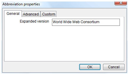 The use of "Full Text" for abbreviations and acronyms can better convey the meaning of content to users of assistive technologies, but overuse of "Full Text" can become annoying. As a best practice, XStandard therefore prompts for "Full Text" only if the "Full Text" for an abbreviation has not been entered elsewhere.