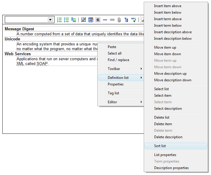 XStandard is fully keyboard-accessible. This makes it possible to edit even complex constructs such as definition lists. The screen shot below shows editing of definition lists using the keyboard.